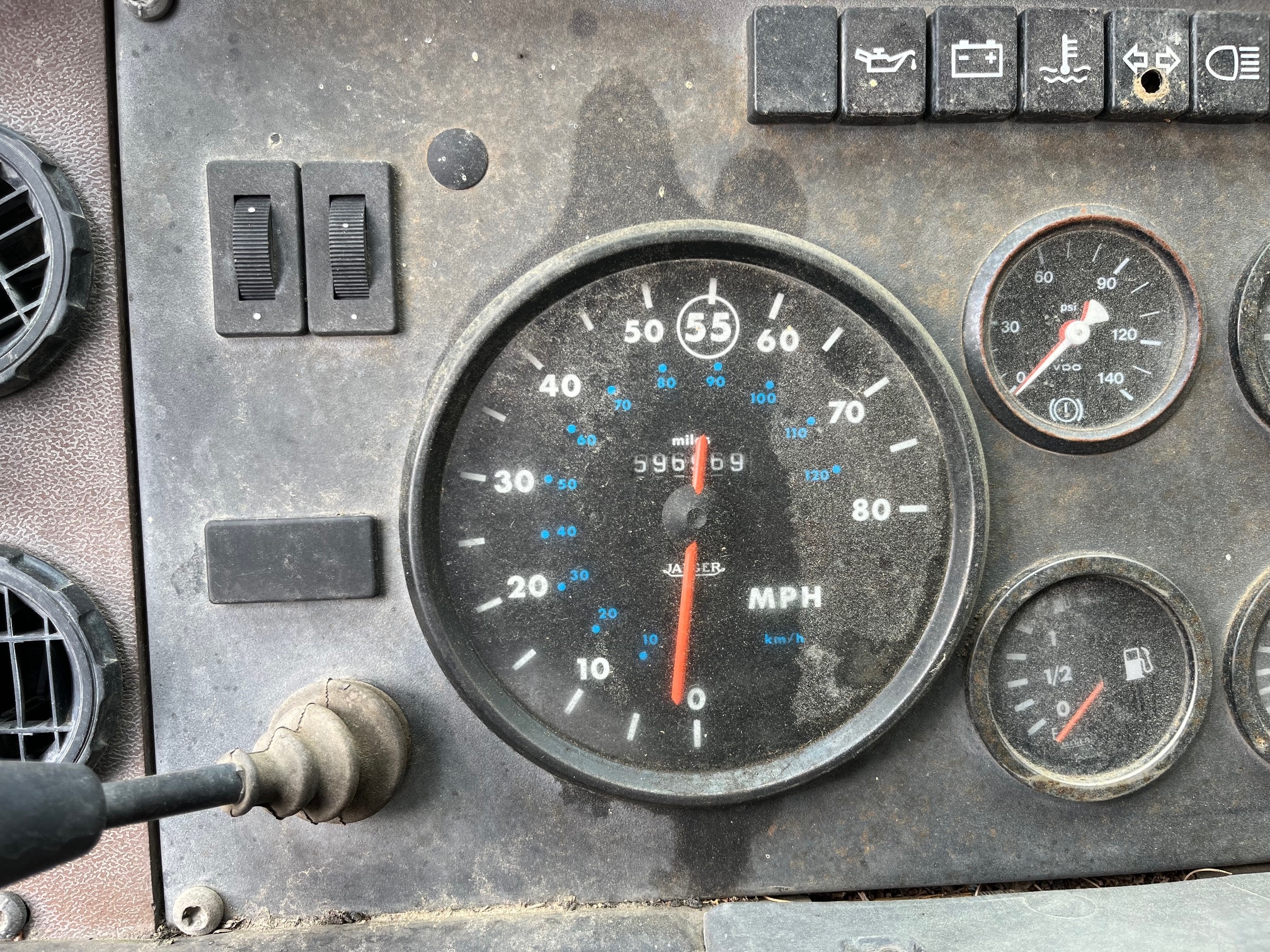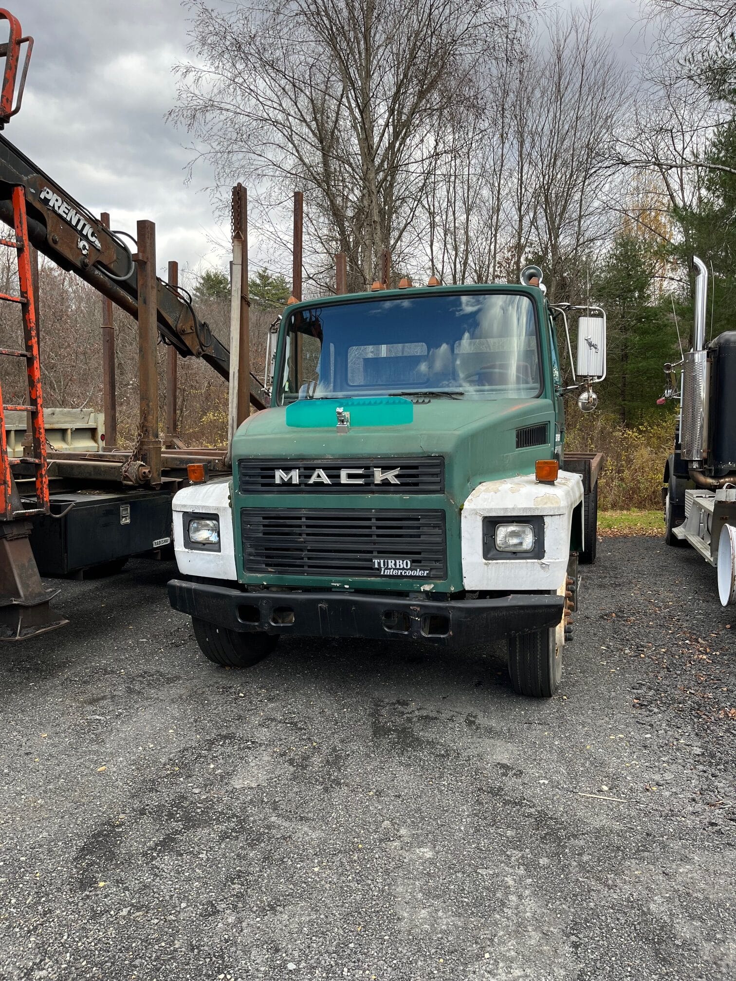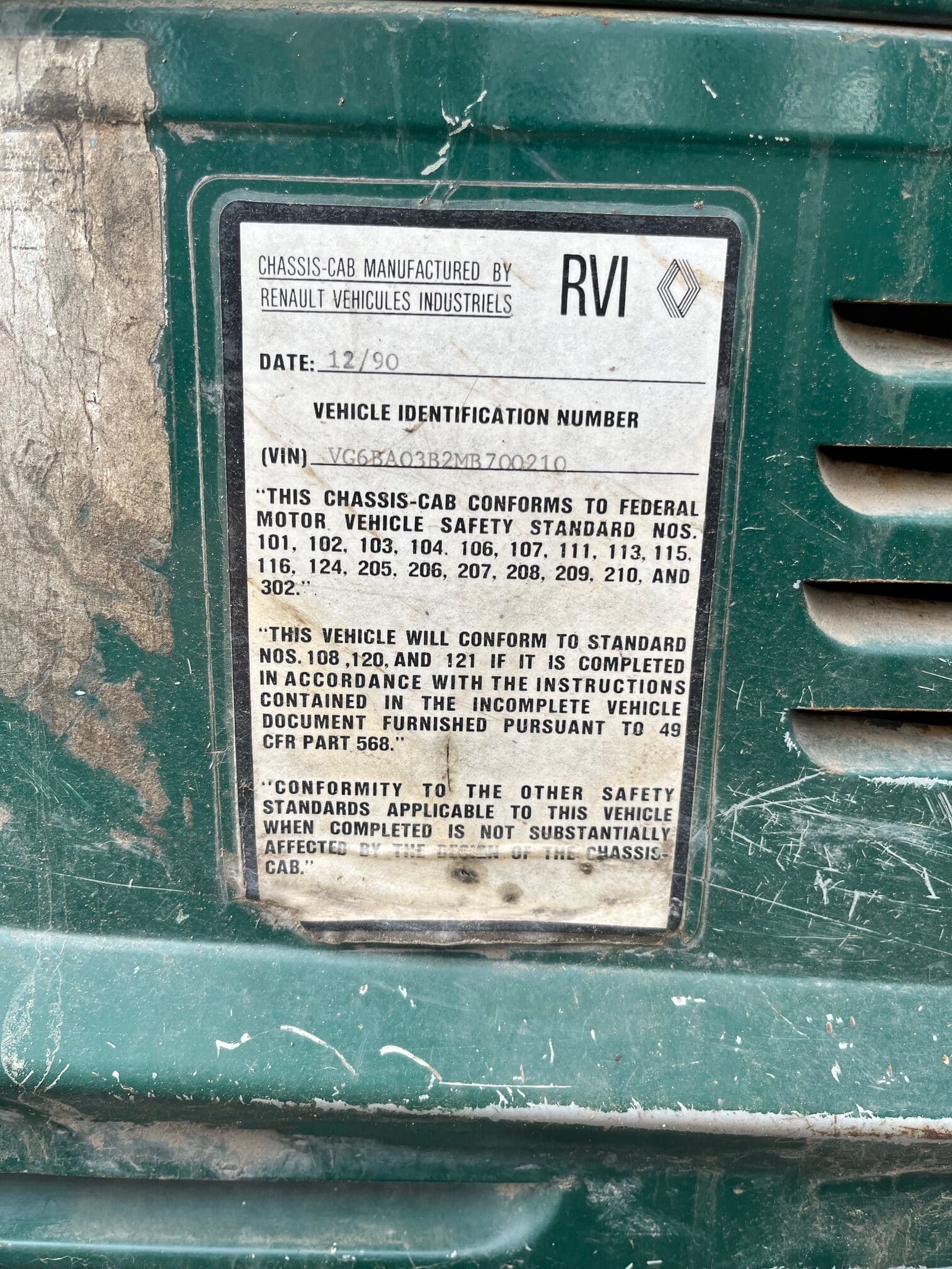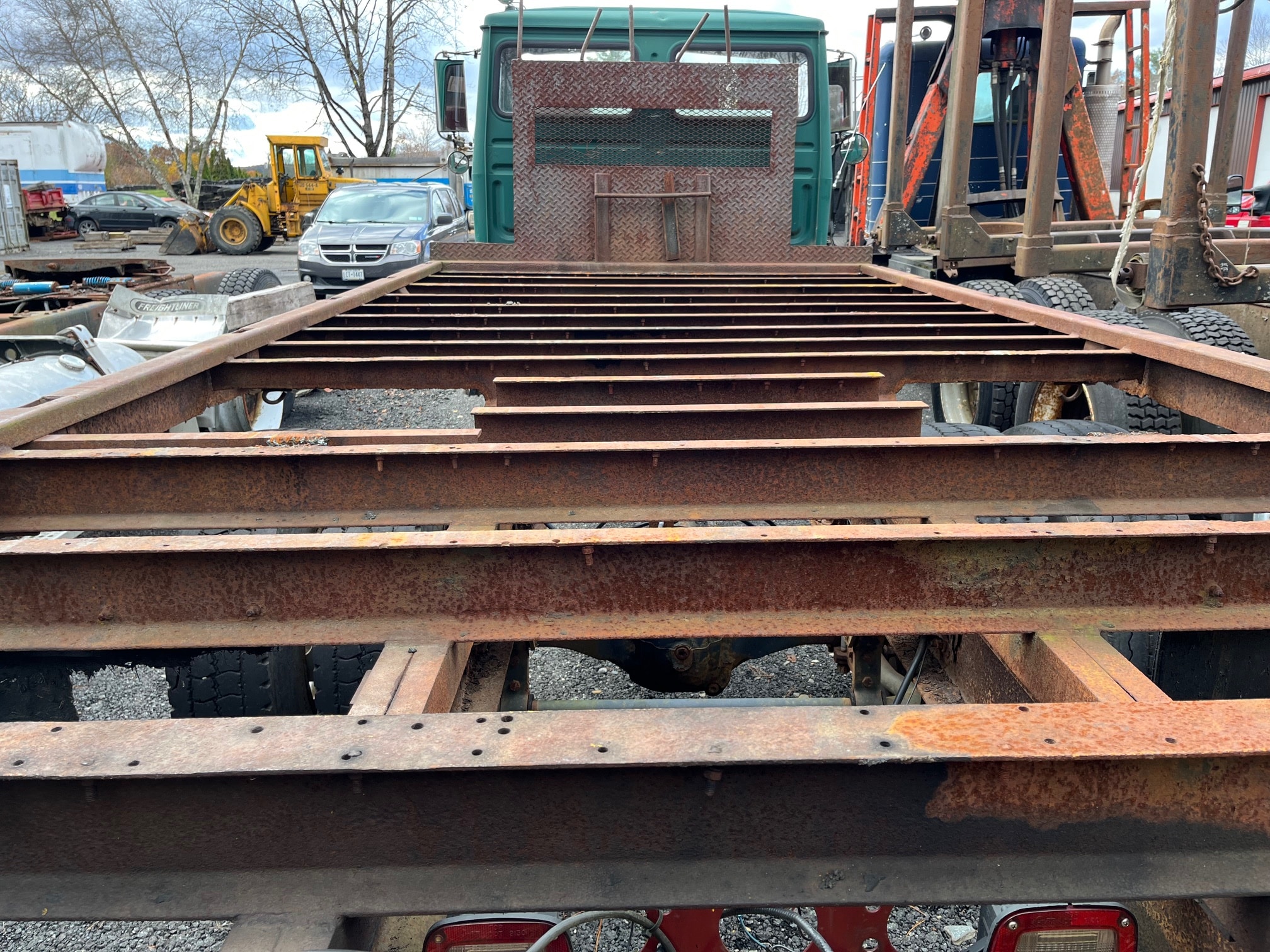Mack Renault Flatbed Truck. 1990 custom steel bed flatbed delivery truck work truck. The engine is a turbocharged 6-cylinder Mack with a 5-speed transmission. The steering axle suspension weight on the truck is 12,000 lbs. The rear axle weights are 33,000 lbs. The steel deck measures 8 feet wide by 16 feet long. The wheelbase is 245 inches. GVW is 35,000 lbs.
